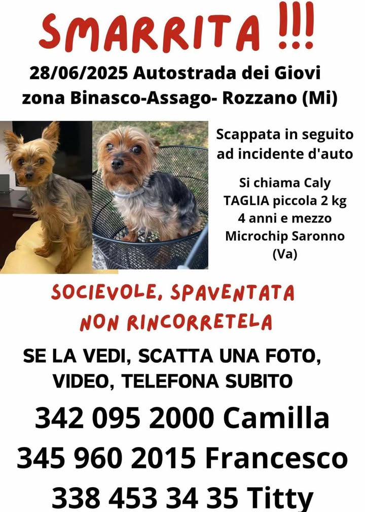 Buongiorno. Vi prego aiutateci, siamo disperati. abbiamo perso la nostra cagnolina la notte tra sabato 28 e domenica 29 in seguito a un incidente in autostrada a Milano sulla A7 che porta ovunque, quindi anche Svizzera.