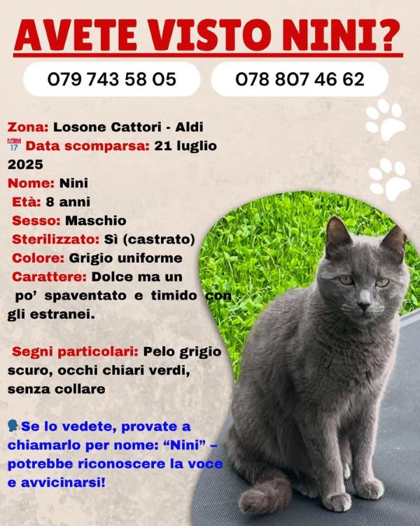 Dal 21.07.2025 a Losone zona Cattori/Aldi, il gatto Nini non fa ritorno a casa. Nini è un maschio castrato di 8 anni, dolce ma un poco spaventato e timido con gli estranei.